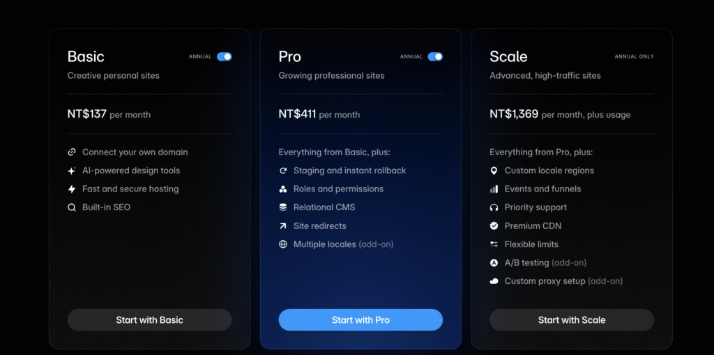 • Scale:適合品牌公司網站,解鎖所有功能,包括數據分析和每月最多 200,000 位訪客。